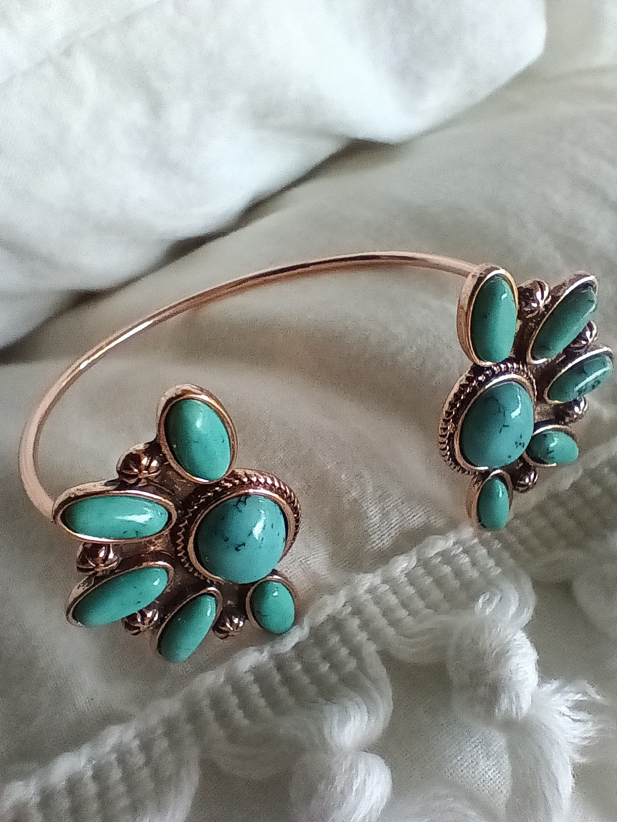 This cuff bracelet features copper colored metal and turquoise style stones.